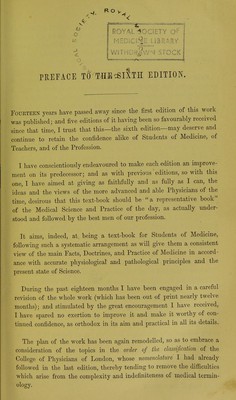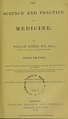 ![SCIENCE AND PRACTICE OP medicine. BY WILLIAM AITKEN, M.D., Edin., PROFESSOR OF PATHOLOGY IN THE ARMY MEDICAL SCHOOL. SIXTH EDITION. GREATLY ENLARGED, RE-MODELLED, CAREFULLY REVISED, AND MANY PORTIOAS RE-WRITTEN, (ADOPTING THE NEW NOMENCLATURE, AND FOLLOWING THE ORDER OF CLASSIFICATION OF DISEASES PUBLISHED BY THE ROYAL COLLEGE OF PHYSICIANS OF LONDON, 1869.) WITH STEEL PLATE, MAP, .0* *© IN* TWO VOLUMES, UPWARDS OF ONE Hl^SDRED AND — V VOL. I. - O PIFTY WOODCUTS. LONDON: CHARLES GRIFFIN AND COMPANY, stationers’ iiall court. 1872. [The Author reserves the Bight of Translation.]](https://iiif.wellcomecollection.org/image/b20414857_001_0007.jp2/full/800%2C/0/default.jpg)