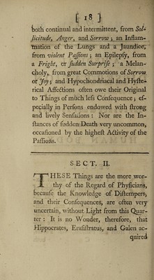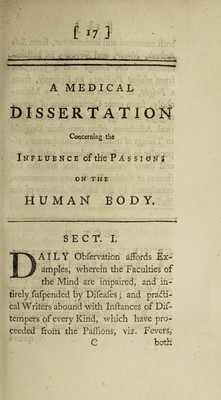 ![[ *7 ] A MEDICAL - . . *, •„ DISSERTATIO Concerning the Influence of the Passions ON THE HUMAN BODY. SECT. I. % _- AILY Obfervation affords Ex- • ^ t c ' i JZ . amples, wherein the Faculties of the Mind are impaired, and in- tirely fufpended by Difeafes ; and practi¬ cal Writers abound with Inftances of DiF tempers of every Kind, which have pro¬ ceeded from the Paffions, viz. Fevers e](https://iiif.wellcomecollection.org/image/b3078380x_0001_0015.jp2/full/800%2C/0/default.jpg)