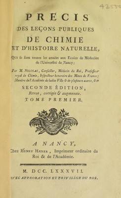 Précis de leçons publiques de chimie et d'histoire naturelle, qui se font ... aux Écoles de Médecine de l'Université de Nancy / [Pierre François Nicolas].