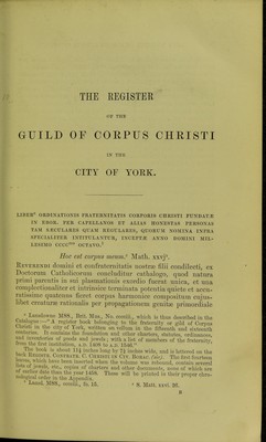 The register of the Guild of Corpus Christi in the city of York : with an appendix of illustrative documents, containing some account of the Hospital of St. Thomas of Canterbury, without Micklegate-Bar, in the suburbs of the city.