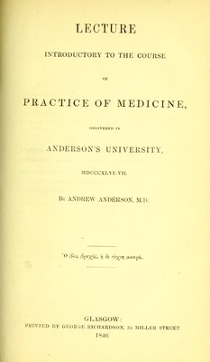 Credit: Lecture introductory to the course of Practice of medicine, delivered in Anderson's University, MDCCCXLVI-VII / by Andrew Anderson, M.D. Source: Wellcome Collection.