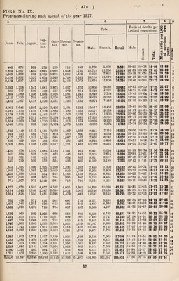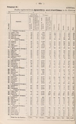 ![Paragraphs 45 and M.] ANNUAL Deaths registered from plague in the districts 1 2 3 4 Circles of registration. Villages. Number. District. Number in each district. Number from which deaths from plague were reported. Number in each district. Number from which deaths from plague were reported. January. February. March. April. > C3 S ! 1 2 Meerut Division. Pehra Dun Saharanpur 14 30 13 494 1.618 71 • •• 20 « •• 7 «•* 31 41 • • • 47 3 Muzaffarnagar 26 13 928 36 19 88 263 191 70 1 4 Meerut 45 12 1,534 36 4 52 111 99 , 5 Bulandshahr 35 ii 1,417 13 13 6 31 39 21 6 Agra Division, Aligarh 37 1 - 1,748 2 1 ■ 1 * • • 2 7 Muttra 32 5 891 6 1 1 23 19 • t • 8 Agra 37 1 1,233 7 12 21 27 16 1 9 Mainpuri ... 22 1,368 • • • • • • ... • •• 10 Etah 31 1,551 • • i • •« • • • • • • 11 Rohilkhand Division. Bareilly 31 13 2,196 19 95 79 125 123 39 12 Bijnor 31 9 2,154 16 45 23 ■ 22 23 7 13 Budaun 28 12 1,659 59 65 57 94 99 57 14 Moradabad 34 19 2,657 27 110 42 44 72 67 15 Shahjahanpur 23 7 2,388 9 2 • •• 44 30 11 16 Pilibhit 15 2 1,094 2 • • • »• • • • • Q«0 «• < 17 Allahabad Division. Farrukhabad 24 • • • 1,717 • ft • • • • • • • • • * ♦ • • ... 18 Etawah 25 1,487 • • • « • * • • * • • ft • • '** I 19 Cawnpore ... 28 12 1,972 19 11 37 85 72 8 20 Fatehpur ... 16 2 1,436 4 24 4 • • . • • . 21 Allahabad ... 36 8 3,864 63 56 38 136 64 11 22 jhansi Division. Jhansi 39 • •• 1,323 • • • • • « in • • ■ • • * 23 Jalaun 15 848 • • § * • ° • • « • •• • •• ••1 24 Hamirpur ... 24 1 798 1 «• ♦ ft •* 5 • •« i 25 Banda 21 • • « 1,231 «»• . • • • • • • • • 26 Benares Division. Benares 17 2,117 • • • 4 13 7 27 Mirzapur ... ... 23 1 3,142 6 19 5 10 3 • • * 28 Jaunpur 22 5 3,169 16 35 41 52 39 • • 29 Ghazipur ... 22 12 2,390 343 188 362 618 515 118 30 Ballia 19 4 1,740 101 88 109 207 134 26 31 Gorakhpur Division. Gorakhpur 47 16 7,208 54 133 192 342 215 25 32 Basti 25 12 6,921 164 124 222 203 95 14 33 Azamgarh ... 34 27 4,809 448 449 805 1,065 468 30 34 Kumaun Division. Naini Tal 20 3 1,650 3 35 33 15 10 « • 35 Almora 6 2 5,082 3 • •• 2 1 • • • 36 Garhwal 15 • • • 3,605 • • « • • • • •• • •• .ft. | 37 Lucknow Division. i Lucknow ... 15 4 937 9 11 16 33 11 41 S8 Unao 19 8 1,715 26 29 42 51 43 19 39 Rae Bareli 14 4 1,748 28 52 50 21 53 20 40 8'itapur 23 8 2,311 1,897 37 35 33 82 63 26 41 Hardoi 25 9 21 62 60 76 83 38 42 Kheri 16 8 l,73i 18 37 18 60 93 36 43 F'yzabad Division. Fyzabad 23 11 2,951 69 61 170 118 70 4 44 Gonda 25 1 2,910 6 2 • • • 45 Bahraich ... 19 ft Oft 1,894 • • • • • • • • • ft ft 0 • • • • •» 46 Sultanpur ... ... 14 3 2,490 13 3 14 9 5 3 47 Partabgarh 16 • • * 2,188 • •* • •* 1 ... 48 Bara Banki 28 11 2,070 38 52 67 102 60 16 854[](https://iiif.wellcomecollection.org/image/b3140490x_0294.jp2/full/800%2C/0/default.jpg)