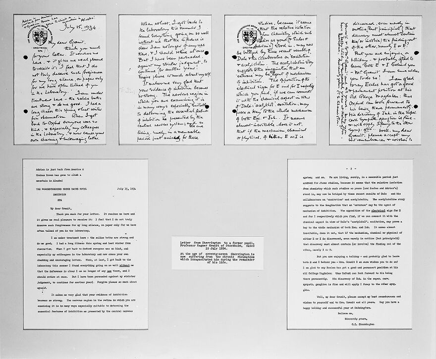Credit: M0016233: Display board: letter from Sherrington to Regner Granit and transcript, 15 July 1934. Source: Wellcome Collection.