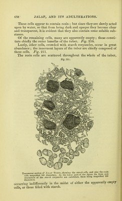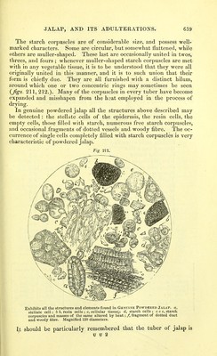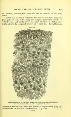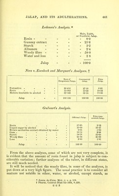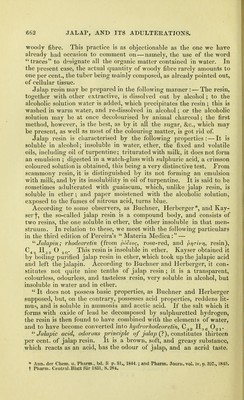 ![woody fibre. This practice is as objectionable as the one we have already had occasion to comment on — namely, the use of the word traces to designate all the organic matter contained in water. In the present case, the actual quantity of woody fibre rarely amounts to one per cent., the tuber being mainly composed, as already pointed out, of cellular tissue. Jalap resin may be prepared in the following manner : — The resin, together with other extractive, is dissolved out by alcohol; to the alcoholic solution water is added, which precipitates the resin ; this is washed in warm water, and re-dissolved in alcohol; or the alcoholic solution may be at once decolourised by animal charcoal; the first method, however, is the best, as by it all the sugar, &c., which may be present, as well as most of the colouring matter, is got rid of. Jalap resin is characterised by the following properties: — It is soluble in alcohol; insoluble in water, ether, the fixed and volatile oils, including oil of turpentine; triturated with milk, it does not form an emulsion ; digested in a watch-glass with sulphuric acid, a crimson coloured solution is obtained, this being a very distinctive test. From scammony resin, it is distinguished by its not forming an emulsion with milk, and by its insolubility in oil of turpentine. It is said to be sometimes adulterated with guaiacum, which, unlike jalap resin, is soluble in ether ; and paper moistened with the alcoholic solution, exposed to the fumes of nitrous acid, turns blue. According to some observers, as Buchner, Herberger*, and Kay- serf, the so-called jalap resin is a compound body, and consists of two resins, the one soluble in ether, the other insoluble in that men- struum. In relation to these, we meet with the following particulars in the third edition of Pereira's Materia Medica: — '''Jalapin; ?'hodeoretin (from podeoc, rose-red, and prjrlvr], resin), H35 O This resin is insoluble in ether. Kayser obtained it by boiling purified jalap resin in ether, which took upthe jalapic acid and left the jalapin. According to Buchner and Herberger, it con- stitutes not quite nine tenths of jalap resin ; it is a transparent, colourless, odourless, and tasteless resin, very soluble in alcohol, but insoluble in water and in ether. It does not possess basic properties, as Buchner and Herberger supposed, but, on the contrary, possesses acid properties, reddens lit- mus, and is soluble in ammonia and acetic acid. If the salt which it forms with oxide of lead be decomposed by sulphuretted hydrogen, the resin is then found to have combined with the elements of water, and to have become converted into hydrorhodeoretin^ O^j. Jalapic acid, odorous principle of jalap (?), constitutes thirteen per cent, of jalap resin. It is a brown, soft, and greasy substance, which reacts as an acid, has the odour of jalap, and an acrid taste. * Ann. der Chem. u. Ph.irm., bd. li p. 81., 1844.; and Tharm. Journ. vol. iv, o. 327., 1845. t Pharm. Central-Blatt fur 1831, S.284.](https://iiif.wellcomecollection.org/image/b20410062_0692.jp2/full/800%2C/0/default.jpg)