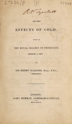 Credit: On the effects of cold; read at the Royal College of Physicians, March 4, 1837 / [Henry Halford]. Source: Wellcome Collection.