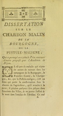 Dissertation sur le charbon malin de la Bourgogne, ou la pustule maligne : ouvrage couronné par l'Académie des sciences, arts & belles-lettres de Dijon, le 14 février 1780 / par M. Thomassin.