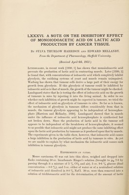 Credit: A note on the inhibitory effect of monoiodoacetic acid on lactic acid production by cancer tissue / by Sylvia Thurlow Harrison and Edward Mellanby. Source: Wellcome Collection.