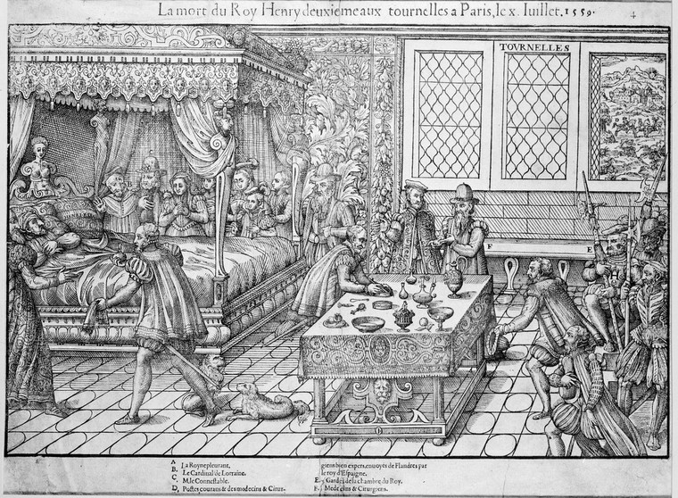 M0019802: King Henry II of France on his deathbed, with members of the royal family and the royal household in attendance, woodcut. Public Domain Mark. Source: Wellcome Collection.