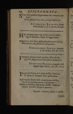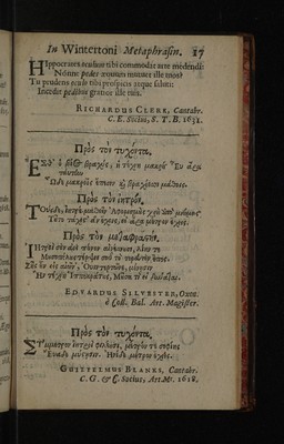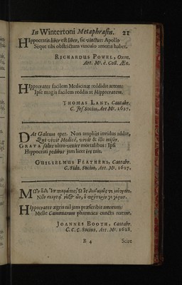 Epigrammata regiorum medicinae professorum, Cantabrigiensis atque Oxoniensis ... / In Radulphi Wintertoni metaphrasin nuper editam. Quibus accedunt epigrammata therpeutics ejusdem, ad malevoroum letorum aegritidinis.