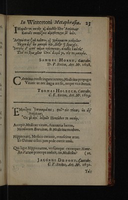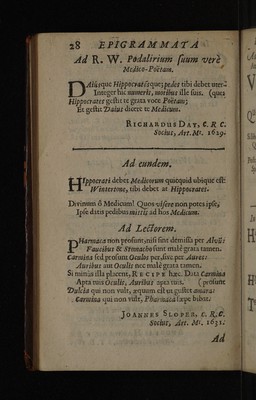 Credit: Epigrammata regiorum medicinae professorum, Cantabrigiensis atque Oxoniensis ... / In Radulphi Wintertoni metaphrasin nuper editam. Quibus accedunt epigrammata therpeutics ejusdem, ad malevoroum letorum aegritidinis. Source: Wellcome Collection.