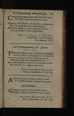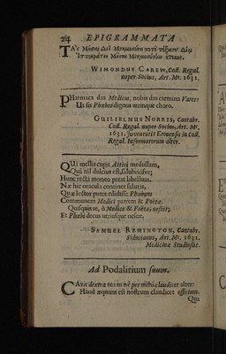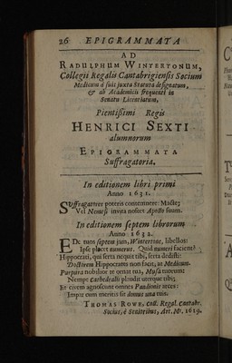 Epigrammata regiorum medicinae professorum, Cantabrigiensis atque Oxoniensis ... / In Radulphi Wintertoni metaphrasin nuper editam. Quibus accedunt epigrammata therpeutics ejusdem, ad malevoroum letorum aegritidinis.