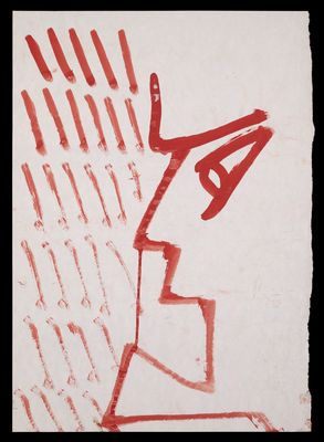 Red diagonal lines and a face in profile