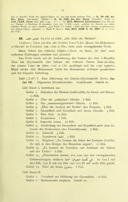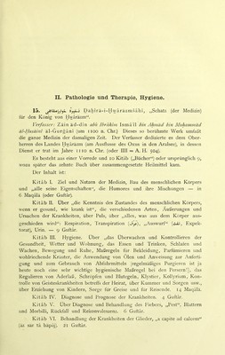 ![15. Dahirä-i-Hwäräzmsähi, „Schatz (der Medizin) für den König von Hwäräzm“. Verfasser: Zain äd-din abü Ibrahim Ismä il bin Ahmad, bin Muhammäd äl-Husäini äl-Gurgani (um 1100 n. Chr.) Dieses so berühmte Werk umfaßt die ganze Medizin der damaligen Zeit. Der Verfasser dedizierte es dem Ober- herren des Landes Hwäräzm (am Ausflusse des Oxus in den Aralsee), in dessen Dienst er trat im Jahre iiio n. Chr. (oder IIII = A. H. 504). Es besteht aus einer Vorrede und 10 Kitäb („Bücher“) oder ursprünglich 9, wozu später das zehnte Buch über zusammengesetzte Heilmittel kam. Der Inhalt ist: Kitäb I. Ziel und Nutzen der Medizin, Bau des menschlichen Körpers und „alle seine Eigenschaften“, die Humores und ihre Mischungen — in 6 Maqälä (oder Guftär). Kitäb II. Über „die Kenntnis des Zustandes des menschlichen Körpers, wenn er gesund, wie krank ist“, die verschiedenen Arten, Äußerungen und Ursachen der Krankheiten, über Puls, über „alles, was aus dem Körper aus- geschieden wird“: Respiration, Transpiration fif), „Auswurf“ (öü, Expek- torat), Urin. — 9 Guftär. Kitäb III. Hygiene. Über „das Überwachen und Kontrollieren der Gesundheit, Wetter und Wohnung, das Essen und Trinken, Schlafen und Wachen, Bewegung und Ruhe, Maßregeln für Bekleidung, Parfümieren und wohlriechende Kräuter, die Anwendung von Ölen und Anweisung zur Anferti- gung und zum Gebrauch von Abführmitteln [regelmäßiges Purgieren ist ja heute noch eine sehr wichtige hygienische Maßregel bei den Persern!], das Regulieren von Aderlaß, Schröpfen und Blutegeln, Klystier, Kollyrium, Kon- trolle von Geisteskrankheiten betreffs der Heirat, über Kummer und Sorgen usw., über Erziehung von Kindern, Sorge für Greise und für Reisende. 14 Maqälä. Kitäb IV. Diagnose und Prognose der Krankheiten. 4 Guftär. Kitäb V. Über Diagnose und Behandlung des Fiebers, „Pest“, Blattern und Morbilli, Rückfall und Rekonvaleszenz. 6 Guftär. Kitäb VI. Behandlung der Krankheiten der Glieder, „a capite ad calcem“ (äz sär tä bäpäj). 21 Guftär.](https://iiif.wellcomecollection.org/image/b28037935_0019.jp2/full/800%2C/0/default.jpg)