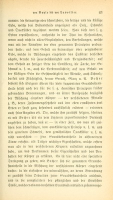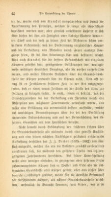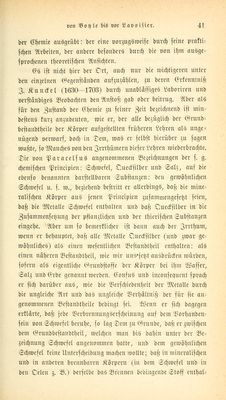 ![ber (Steinte ausgeübt: ber eine ooraugäroeife burtf» feine pvattU Jdjen arbeiten, ber anbere befonberä bnrtf) bic öon Üjtri anSge= fprodjenen ttjeoretifdjcn ^tnfidjten. (?3 i[t md)t fjtcr ber Ort, and) nur bie wichtigeren unter ben einzelnen ^egenftänben anf^n^ätjten, 31t beren Grfenntniji 3. Äuncfcl (1630—1703) bnrd) nnabtäfftges Saoortren nnb ocrftänbigcä ©eobaditen ben 5tnftoß gab ober beitrug. 2C6er atä für ben 3nftanb ber ©lernte 31t feiner $ät bejetdjnenb ift mtn= befteuS tur$ an^nbenten, raic er, ber alle besngüd) ber ©runb- beftanbtfieite ber Körper anfgeftetlten früheren ßefjren atö nnge = nügenb öerroarf, bod) in $Dem> roa§ er fetbft hierüber 31t fagen rannte, fo NI>cand)e3 tmn ben S'rrtfjumern biefer i'etjren mieberbraebte. Die uon ^aracetfuS angenommenen $k3eid)itungen ber f. g. d)emifd)en ^rineipien: (Ecfjroefet, Oaiecffitber nnb ©(1(5, auf bie ebenfo benannten barftellbaren ©nbftansen: ben geroöbntidjen ©djroefcl n. f. ro., 6e3tcr>enb beftritt er allcrbingö, baf; bie mine= ratifdjen Körper an3 jenen ^rineipien 3nfammengefet^t feien, ba$ bie Metalle Sdjroefet entbalten nnb ba£ Oatecffitber in bic ^nfammenfetutng ber pftan^idjen nnb ber tbierifdjen Snbftanjen eingebe. ?lber um fo bemerftidier ift bann and] ber ^srrttjnm, ntnn er behauptet, baf} alle Metalle Ouecrftlber (nnb 3roar ge- roötjnlidjeö) ätä einen mcfentlidicn y3eftanbtt)eil enthalten: al§ einen näheren 23eftanbtf)ei(, rote mir nno'jet^t aitöbrücf en mürben, fofem als eigentliche ©runbftoffe ber Jtörper bei ibm Gaffer, ^al3 nnb (vrbe genannt roerben. Gonfn3 nnb tnconfeqnent fprad) er fid) barüber an§, rote bie ^erfdjiebenfjeit ber Metalle bnrd) bie nngleidie %xt nnb ba§ ungleiche a3er$ättmjg ber für fie aus genommenen Söeftänbtfjeite bebingt fei. 2Bettn er fid) bagegen ertlärte, bafj jebc §Berbrenratng§erfd)ettuittg auf bem ^orbanbem fein uon <2d)mcfe( berntje, fo tag Dem 311 ©runbe, bafj er greifdjett bem (^rnnbbeftanbtf)cil, metdien man 6t§ babin unter ber 23e- 3eid)nnng 3d)mefel angenommen fyatte, nnb bem geroöfjntiäjett ©djroefel feine Unterfdjeibung macben mollte; baf in mineratifd)en nnb in anberen brennbaren .Körpern (in bem 3d)iocfe( nnb in ben Celen 3. 43.) berfetbe bao brennen beoingenbe Stoff cntfiaU](https://iiif.wellcomecollection.org/image/b21017281_0067.jp2/full/800%2C/0/default.jpg)