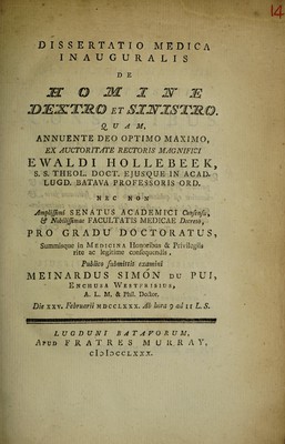Dissertatio medica inauguralis de homine dextro et sinistro ... / [Meinard Simon du Pui].