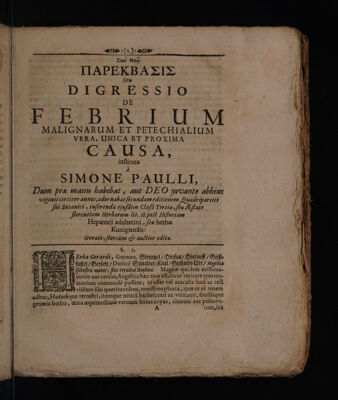 Parekbasis seu digressio de vera, unica, ac proxima causa, febrium cum malignarum et petechialium; tum morbillorum, scorbuti, luis venereae et similium morborum macularum ... nec non de accurata febres has curandi methodo / ... Ab ipso auctore ... recognita, aucta et iterato edita.