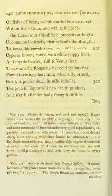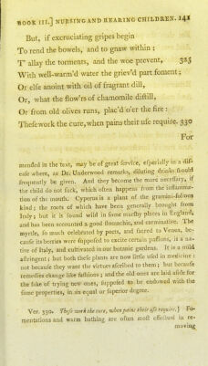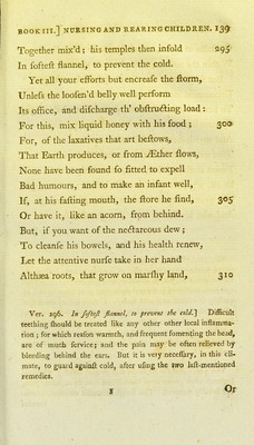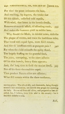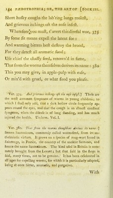 ![Short hulky coughs the lab'ring lungs moleft, iVnd grievous itchings oft the nofe infeft. Wherefore]you muft, t' avert this direful woe, 375 By fome fit means expell the latent foe : And warming bitters beft deftroy the brood. For they.deteft all aromatic food ; Ufe chief the chaffy feed, renown'd in fame. That from the worms themfelves derives its name : 380 This you may give, in apple-pulp with eafe. Or mix'd with gruel, or what food you pleafe. Ver. 374. And grievous itchings oft the nofe infeft.] Thefe are the moft common fymptoms of worms in young children; to which I fliall only add, that a dark hollow circle frequently ap- pears round the eyes, and that the cough is an a!moft conftant fymptom, when the difeafe is of long flanding, and has much injured the health. Underw. Vol. I. Ver. 380. T^hat from the 'worms themfelves derives its name;] Semen Santonicum, commonly called worm-feed, from its an- thelmintic virtues. It grows on a fpecies of mug-wort found in Saintonge, in prance, the country of the ancient Santones, and hence the name Santonicum. The kind ufed in Britain is com- monly brought from the Levant; but that fold in the Ihops is faid, many times, not to be genuine. It has been celebrated in all ^^s-for expelling worms, for whith it is particularly adapted, te^ng at once bitter, aromatic, and purgative. Widi](https://iiif.wellcomecollection.org/image/b21958890_0342.jp2/full/800%2C/0/default.jpg)