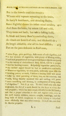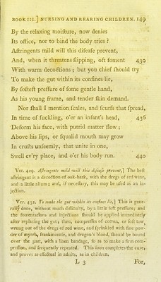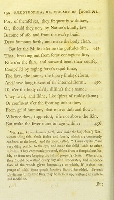 ![For, of themfelves, they frequently withdraw, Or, fliould they not, by Nature's kindly law Become of ufe, and from the wat'ry brain Draw humours forth, and make the body clean. But let the Mufe defcribe the piiftules dire, 445 That, breaking out from fome contagious fire. Rife o'er the Ikin, and outward bend their courfe, Compell'd by raging fever's rapid force. The face, the joints, the fnowy limbs deform. And leave long tokens of th' internal ftorm ; 450 If, o'er the body rais'd, diftindl their name. They fwell, and Ihine, like fpires of ruddy flame ; Or confluent o'er tlie fpotting infant flow, Erom gelid humour, that moves dull and flow, Whence they, fupprefs'd, rife not above the flvin. But make the fever more to rage within; 456 Ver. 444. Draiu hummrs forth, and make the body clean.] Not- withftanding this, thefe fcales and fciirfs, which are commonly confined to the head, and therefore called, Tinea capitis, are very difagreeable to the eye, and make the child liable to other difeafes. They commonly proceed, either from a fcrophulous ha- bit, or from not keeping the infant properly clean. Wherefore, they fliould be waflied every day with lime-water, and a decoc- tion of the woods given internally; to which, if it does not purge of itfelf, fome gentle laxative fliould be added. Several phyficians think that they may be healed up, without any inter- md medicine. But](https://iiif.wellcomecollection.org/image/b21958890_0348.jp2/full/800%2C/0/default.jpg)