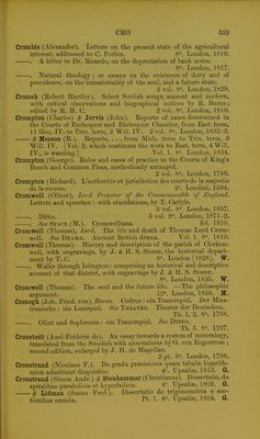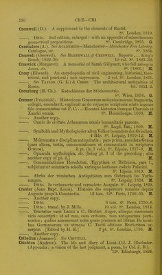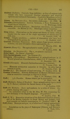 ![Cronstrand ^ Behm (Carolus). Dissertatio cle trigonometria, etc. Pt. 2. 4°. Upsalia), 1804. G. Crook (John), The charity schools of Saint Clement Danes, West- minster, with cursory observations and remarks. 8°. London, 1813. W. Crookshanks (John). Minutes and proceedings of a court-martial held on J. 0., formerly captain of H.M.S. Lark, published by E. Kirke, Judge Advocate of the said court-martial. ' 8°. London, 1772. Crosbie (Sir John). Memoirs of Sir J. C. (with a copy of his will). [Note, wants title-page.] fol, [1791.] ^7. Crosby (Brass), Memoir of B. C, Alderman of the Gty of London,' and Lord Mayor 1770-71. 4°, London, 1829, W. Crosby (Thomas). The London practice; or, an easy ... method to determine the amount of any quantity, at any price. 8°. London, 1719. G. Crosby-Hall. C.-H. lectures on education. 8°. London [1848]. M. Crosfield (Miss A.). The history of North-AUerton, in the county of York ; with a [poetical] description of the Castle-hills. (Praise of Yorkshire ale, by G-. Morrjugton.) 8°. Northallerton, 1791. Crosfield (George), Calendar of flora, composed in 1809, at Warrington, 8°. Warrington, 1810, Cross (John), M.D. An attempt to establish physiognomy upon scientific principles. 8°. Glasgow, 1817. M. Cross (Peter Brady), An .. . impartial view of the practical benefits ,.. of the laws and constitution of England. 8°. London, 1797, Cross (William), An expostulatory address to the public, 8°, Manchester, 1800. Crossley ( John Thomas) ^ Martin (William). Every boy's arithmetic : the intellectual calculator, or manual of practical arithmetic , , , and complete course of mental arithmetic, 50th edition, 12°, London [1834 ?]. Q. Crosthwaite (J. C). Modem hagiology, an examination of some works published under the sanction of J. H. Newman, Dr. Pusey, and P. Oakeley. 2 vol. 8°. London, 1846. M, Crosthwaite (Peter). An accurate map of the matchless lake of Derwent, . • . surveyed, &c, by P. C.; (ditto, of Broadwater or Bassenthwaite lake ; of Buttermere, Crummock & Lowes-water lalces. Scale Force, &c., of Windermere, of Coniston, of Ulls-water, of Pockhngton's Island) republished with additions. 7 sheets [in 1 vol. 8°]. London, 1794. Crouch (Nathaniel). Historical remarques and observations of the ancient and present state of London and Westminster ; by E. Burton [i. e. N. C.]. 3d edition, enlarged. 12°. London, 1684 W. . Ditto. 5th edition. 12°. London, 1703, W. • Difcto. 12°. London, 1730. W. . Ditto; a new edition. 4°. Westminster, 1810. W. Croucher (Joseph). Analytical hints on the patent marine time-keeper made by J. C. 8°. London. G. Crousaz (Jean Pierre de). Divers ouvrages. 2 torn, (in 1). 8°. Amsterdam, 1737. G.'](https://iiif.wellcomecollection.org/image/b22652565_0001_0546.jp2/full/800%2C/0/default.jpg)