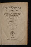 The anatomy of melancholy : what it is. With all the kindes, causes, symptomes, prognosticks, and severall cures of it - in three maine partitions, with their severall sections, members, and subsections / philosophically, medicinally, historically, opened and cut up by Democritus Junior [i.e. Robert Burton] - with a satyricall preface, conducing to the following discourse. Public Domain Mark. Source: Wellcome Collection.