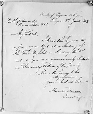 M0019508: Announcement of the election of Joseph Lister as an honorary member of the Faculty of Physicians and Surgeons of Glasgow, 1898