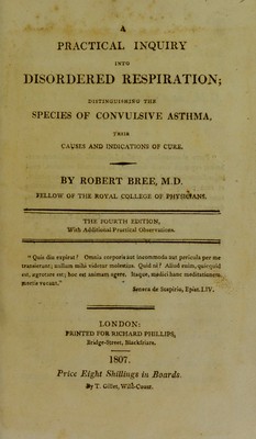 A practical inquiry into disordered respiration; distinguishing the species of convulsive asthma, their causes and indications of cure / [Robert Bree].