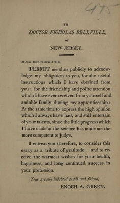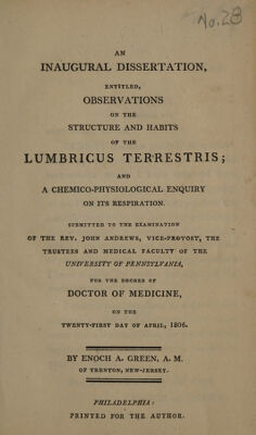 An inaugural dissertation, entitled, Observations on the structure and habits of the Lumbricus terrestris; and a chemico-physiological enquiry on its respiration. Submitted to the examination of the Rev. John Andrews, Vice-Provost, the trustees and medical faculty of the University of Pennsylvania, for the degree of Doctor of Medicine, on the twenty-first day of April, 1806 / By Enoch A. Green, A.M.