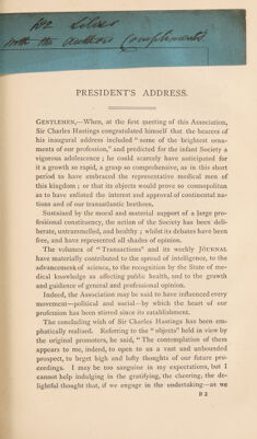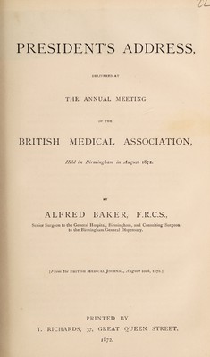 ![PRESIDENT’S ADDRESS, DELIVERED AT THE ANNUAL MEETING OF THE BRITISH MEDICAL ASSOCIATION, Held in Birmingham in August 1872. BY ALFRED BAKER, F.R.C.S., Senior Surgeon to the General Hospital, Birmingham, and Consulting Surgeon to the Birmingham General Dispensary. {From the British Medical Journal, August 10th, 1872.] PRINTED BY T. RICHARDS, 37, GREAT QUEEN STREET.](https://iiif.wellcomecollection.org/image/b30571753_0001.jp2/full/800%2C/0/default.jpg)