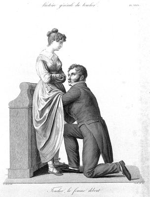 Credit: M0017860: Illustration of a vaginal examination being undertaken in vertical position, 1825. Source: Wellcome Collection.
