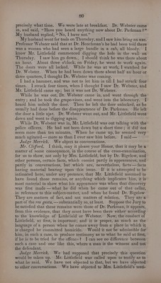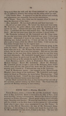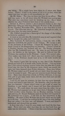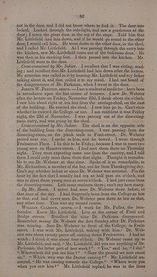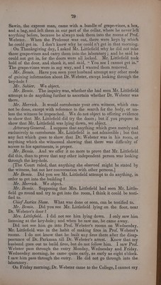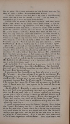 ![into his room. If any one wanted to see him, I would knock on the door, if I found it bolted. I sometimes found it bolted. The reason I did not knock was, that if he chose to keep his doors locked from me, I did not choose to knock. I do not know that I ever tried to get in when his doors were fastened. wrote down the heads of my testimony after I had been before the Coivner. I tried to be correct before the Coroner. I saw Mr. Merrill, and corrected my testimony about the turkey; but I don’t recollect that I made any other. I may have made some minutes before the Coroner’s Inquest, but don’t know. I kept them to look at. Never made a new set. Never wrote them off but once. I have read my testimony before the Coroner’s Inquest a number of times, but can’t say how many times. I kept it in a drawer. I never had a copy of my statement before the Coroner. I had mj own minutes. I never read a word in that book that contains the Coroner’s Inquest. What I read was my own minutes. I never heard it read. I did not want to read it. I could recollect it myself. [Here Mr. Sohier read his statement before the Coroner, in which it was said that he felt the heat on the wall at four o’clock on Wednes-_ day, and heard some one in the laboratory ; and asked him if he had said that. He said he did not know that he had. Mr. Clifford said there was false punctuation in that document, which altered the sense. Chief Justice Shaw said the proceeding was irregular. Judge Merrick proceeded with the cross-examination. He showed Mr. Littlefield an advertisement of a reward, and asked him if he saw it at the time it came out.] Mr. Littlefield. Isaw one like it on Monday, and carried it to the Demonstrator’s room, and showed it to Dr. Holmes. Saw them stick- ing up all about the College, more than any other place. Cannot tell how early I saw the second one. I went over to Kast Cambridge with those who were in search of Dr. Parkman. I asked the toli-man if he was the one that saw Dr. Parkman go over on Friday. Do not recollect saying, at that place, that I saw Dr. Parkman go in or come out of the College. Did not say, at that time, that I saw Dr. Webster pay Dr. Parkman any money. I did not say that I knew Dr. Webster did pay money to Dr. Park- man. Ido not know that I saw a person by the name of Greene at that time. By Mr. Clifford. 1 never have made any claim to any reward. I have said that I never had made any claim, and never should. I say now that I never shall claim it. I had the heads of my testimony written down, and was reading ** over to my wife, and she told me | had made a mistake about the turkey. I went right down to Mr. Foster, and inquired, and found on his books that it was Tuesday. I then went to Mr. Merrill, one of the Coroner’s Jury, and told him, voluntarily correcting it. I signed two depositions before the Coroner’s Inquest. I was before the Coroner’s Jury nearly two days. [Mr. Clifford said the attention of the Jury was called to some cuts or hacks in the sink on the labor- atory floor where the hatchet was found, and asked Mr. Littlefield when he first saw them ; and he said he first saw them on Satur- day after Dr. Webster’s arrest.] Keys of the front doors were found in Dr. Webster’s apartment after his arrest. I never knew that he had](https://iiif.wellcomecollection.org/image/b20443614_0085.jp2/full/800%2C/0/default.jpg)