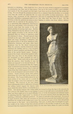 ![THE DEFORMITIES STAYS PRODUCE. [Sect. XVII (atrophy) or shrinking. After death the liver on examination has been seen to bear perma- nent marks of the ribs pressed on it by tight- lacing. For even though the pressure is relaxed every time the corsets are removed, the con- tinuous daily recurrence of the compression gradually establishes a permanent state of con- striction, so that the pai’ts do not return to their normal size on removal of the pressing force. It is undoubted that indigestion, disturbances of the liver and bowels—even ulceration of the stomach—have been the results of the per- sistent practice of wearing tight stays. Besides being themselves directly affected in this way, these organs, according to the amount of dis- placement they are bound to experience, alter the relations of others. Pressed upwards they encroach on the space that ought to belong to heart and lungs, breathing is disturbed, and the natural action of the heart interfered with. Palpitation, faintness, and many other heart symptoms may be the direct consequences. Then the pressure exerted downwards incon- veniences the bladder, and is a very frequent cause of altered positions and disordered func- tions of the special female organs. Displace- ments of the womb, with all the manifold influ- ences they may have on the monthly illness, are recognized as often ju'oduced by such a cause as this. While such evils as these result from the practice, what benefits, it may be asked, are supposed to be derived from it? It can hardly now be maintained that the “taper- waist” is desirable from its beauty. Any standard of beauty as regards human form is derived rather from that which appears to be most per- fect in its development and most natural in its outlines. Greek statuary shows with ])erfect distinctness the views held by the ancients on the subject. The Venus of Melos shows the na- tural outline of the waist, and is a model of what its sculptor must have esteemed an ideal of beauty. The wood-cut in the text, taken from a ])hotograph, while it sufficiently indicates the outline, cannot suggest the dignity and grace which the statue itself so wonderfully ex- hibits. Let anyone compare this outline with that given to the female form in any fashion- plate, and there ought not to be much difficulty in admitting that the “taper-waist” is, .strictly speaking, a deformity artificially produced. It is urged, however, that stays are necessary to distribute the weight of the clothes and to give some support to the back. As to distributing the weight of the clothes, it has been ali’eady indicated that the suspension of so many clothes from the waist, which is supposed to nece.ssitate the use of the corset, is itself a grave mistake, and there can be no doubt that the clothes can be so adjusted from the shoulders as to render any such artifice as stays unnecessary. As to the need of supportiiig the back, that is i-ather the effect than the cause of stays. For the fashion in which, even from infanc}', children Fig. 182.—The Venus of Melos, showing the natural female form. are hedgeil in, from the hips to the arm-jnts, by a more or less stiff wall, is undoubtedly produc- tive of feeble development and deficient vigour of the great muscles which run right down the back on each side of the back-bone. It is one of the first laws of growth that moderate and regu- lar exercise of a part of the body strengthens that part; in short, that its strength is in ]>ro- portion to the use'that is made of it, and that, on the other liand, disuse of a jiart inevitably](https://iiif.wellcomecollection.org/image/b28124674_0001_0546.jp2/full/800%2C/0/default.jpg)
