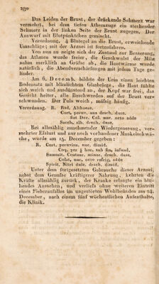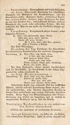 ![Das Leiden der Brüst , der druckende Schillert War •vermeint, bei dem tiefen Atheinzuge ein stechender Schmei‘z in der linken Seite der Brust znge2;en. Der Auswurf mit Blutpünktcben gemischt. Verordnung* 4 Blutegel an die Brust, erweichende Umschläge *, mit der Arznei ist förtzufahren. Von nun an neigte sich der Zustand zur Besserung, das Athmen wurde freier, die Geschwulst der Mifz' nahm merklich an Gröfse ab, die Ilautwärme wurde natürlich , die Abendverschärfiingen mit jedem Ta^e linder. Am 6* Decemb. bildete der Urin einen leichten Bodensatz mit bläulichtem Glasbe]ege , die Haut fühlte sich, weich und ausdünstend an , der Kopf war frei, das Gesicht heiter, alle Beschwerden auf der Brust ver- schwunden. Der Puls weich, mäfsig häufig* Verordnuug. R. Rad. Allhacae. Gort,, peruv. aiia drach. diias. fiat Dec. Coh imc. octo adde Sacch* alb. drach. diias. Bei allmählig zunehmender Wiedergenesung, Ver- mehrter Efslust und nur noch vorhandener Muskelschwä- die5 wurde am 15. December gegeben: R. Gort, peruviauv uuc. dimid. * Coq. per ^ lior. $ub fiu» iuFünd. Summit. Centaur, miuor. drach. duas. Colat» iinc4, oclo refrigi adde Spirit. Nitri diilc. drach. dimid. Unter dem fortgesetzten Gebrauche dieSer Arznei, nebst dem Genufse kräftigerer Nahrung, kehrten die Kräfte allmählig zurück, der Kranke erlangte ein blü- hendes Ansseheii, und verliefs ohne weiteren Eintritt eines Eiebcranfalles im ungestörten Wohlbefinden am 24*^ D ecember , nach einem fünf wüchentlicheii Aufenthalte, die Klinika](https://iiif.wellcomecollection.org/image/b29333398_0001_0300.jp2/full/800%2C/0/default.jpg)