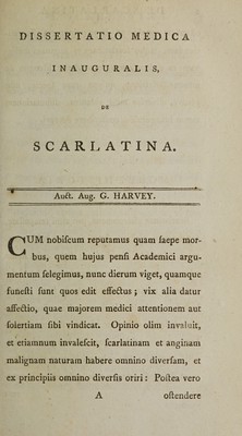 Dissertatio medica inauguralis, de scarlatina ... / Eruditorum examini subjicit Aug. Gul. Harvey ... Bermudensis.