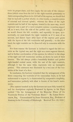 ![tricle its proper share, aiid then apply the cut ends of the common fibres (which cross from the left to the right ventricle posteriorly) to their corresponding fibres in the left half of the septum, we sliould find that we had still a perfect whole—in other words, a complete System of external and internal spirals ; whereas the fibres of the right ventricle and its half of the septum, treated in the same way, would represent only a part of a more complete System—a portion nipped ofif, as it were, from the side of the perfect cone. Accordingly, if we would dissect the left ventricle, and especially its apex, syni- metrically, we must detach the right ventricle as if it were of no account, and dissect layer after layer of the septum pari passu with the layers of the left ventricular wall generally; on the other hand, the right ventricle can be dissected only in connexion with the left. For these reasons the Lecturer is inclined to regard the left ven- tricle as the typical one, and the right as a mere segment thereof; and in further corroboration of this opinion, he referred to the shape of the right and left ventricular cavities, as shown by casts of their interior. The left always yields a beautifully finished and perfect right-handed conical screw, while the cast of the right ventricle, although it has the same twist, represents only an incomplete portion. This Statement was illustrated by a wax-cast of the ven- tricles of the heart of a deer. In conclusion, the Lecturer remarked that the arrangement of the fibres composing the veutricles of the mammalian heart, as he had endeavoured to expose it, is characterized by comparative simpUcity, and harmonizes perfectly with what is known of the heart's move- ments. [The matters touched on by the Lecturer are more fully treated of, and the descriptions copiously illustrated by figures, in his Paper entitled On the Arrangement of the Muscular Fibres of the Ventricular Portion of the Vertebrate Heart. By James Petti- GREW, Esq. Communicated by John Goodsir, Esq., Professor of Anatomy in the University of Edinburgh. Received Nov. 22, 1859.]](https://iiif.wellcomecollection.org/image/b22286469_0054.jp2/full/800%2C/0/default.jpg)
