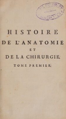 Histoire de l'anatomie et de la chirurgie, contenant l'origine & les progrès de ces sciences; avec un tableau chronologique des principales découvertes, & un catalogue des ouvrages d'anatomie et de chirurgie, des mémoires académiques, des dissertations insérées dans les journaux, et de la plupart des thèses qui ont été soutenues dans les facultés de médecine de l'Europe / Par m. Portal.