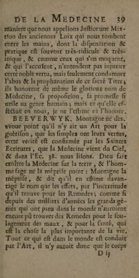 Éloge de la medecine et de la chirurgie. Deffense de la medecine contre les calomnies de Montagne / en forme de dialogue. Par le Sr. Beeverwyk ... Traduit du Holandois par Madame de Zoutelandt.