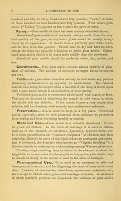 ![Acacia; IT. S. Acacia. Acac'ice Gummi • Gumnii Arahicum—Arabisches Gummi, G,; Gomme Arabique, F.; Goma Ardbiga, Sp.; Arabiskt Gu^nmi, Sw.— Giim Arabic. Origin.—Acacia Verek, Guillemin et Perrottet, and other species of Acacia (Leguminosse). Habitat.—Africa. Part used.—The dry gurnmy exudation. Description.—See the Pharmacopoeia, page 8. Select No. 1 gum arabic—the kind pharmacists use for medicinal purposes—is the grade described in the Pharmacopoeia. It must be free from impurities or •discolored pieces; has but a faint, peculiar, not the least sourish odor; is completely soluble iti an equal weight of water, forming mucilage. Varieties and Grades.—The best acacia comes iroxa Kordofan. ■*' Senaar gum is also of fine quality. Some varieties of gum arabic, although of handsome appearance, do not dissolve completely in water, having probably been dried too far or exposed to a too high temperature in drying, whereby.the arabic acid is altered (see mucilage). Senegal gum is more clear or transparent than Kordofan giirriy having but few fissures; the tears are also larger in this variety of acacia; but it is always more or less colored (yellowish or reddish), and its taste is not as pure. ]\fezquite gum is also discolored, and a mucilage made from it does not give a precipitate with subacetate of lead, ferric chloride, or borax. The different grades of gum arabic in the market are designated by numbers. No. 1 being the best tears selected from the whole lot. The next best selection becomes No. 2, and so on, until about five selections have been made. The remainder, consisting of more or less colored pieces and all the impurities, receives the designation sorts. The term sorts, however, sometimes means the unsorted gum arabic containing all the grades, or consists of all except the first and second grades. Jobbers sometimes distinguish between strong and weak gums, these designations having reference partly to the relative quantity of mois- ture contained in the drug, the strong gums being the drier; and partly to the degree of solubility, the weaker gums being those which swell in water but do not completely dissolve. Original Packages.—Picked gum arable is sold in cases of two](https://iiif.wellcomecollection.org/image/b21070866_0019.jp2/full/800%2C/0/default.jpg)