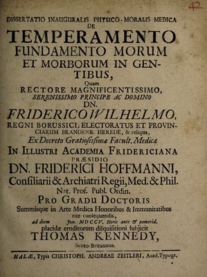 Dissertatio inauguralis physico-moralis medica de temperamento fundamento morum et morborum in gentibus ... / subjicit Thomas Kennedy.