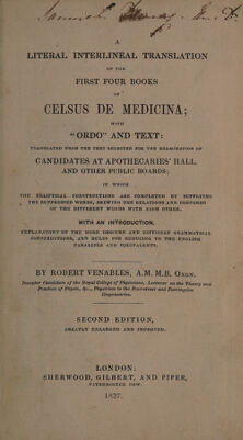 A literal interlineal translation of the first four books of Celsus De medicina; with "Ordo" and text: translated from the text selected for the examination of candidates at Apothecaries' Hall, and other public boards; in which the elliptical constructions are completed by supplying the suppressed words, shewing the relations and concords of the different words with each other / with an introduction ... by Robert Venables.