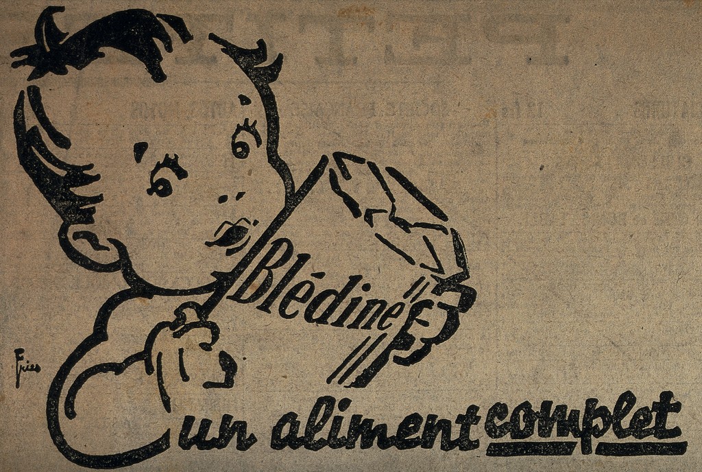 Credit: A toddler holding a box of Blédine, advertising Blédine cereal food for infants. Process print after Leonhard Fries. Source: Wellcome Collection.