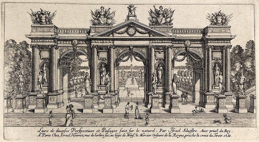 Credit: A triumphal arch in a garden. Etching by Israel Silvestre. Source: Wellcome Collection.