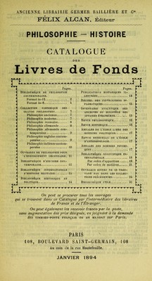 ![Les titres précédés d’un astérisque sont recommandés par le Ministère de l’Instruction publiaue etUco]IèSgfslbll°the<IUeS deS 6 èVeS et deS Profes?eurs et pour les distributions de prix des lycées BIBLIOTHÈQUE DE PHILOSOPHIE CONTEMPORAINE Volumes in-12, brochés, à 2 fr. 50. Cartonnés toile, 3 francs. — En demi-reliure, plats papier, 4 francs. (Quelques-uns de ces volumes sont épuisés, et il n’en reste que peu d’exemplaires imprimés sur papier vélin; ces volumes sont annoncés au prix de 5 francs.) ALAUX, professeur à la Faculté des lettres d’Alger. Philosophie de M. Cousin. ARRÉAT(L.).La Morale dans le drame, l’épopée et le roman. 2e édition, AUBER (Ed.). Philosophie de la medecine. BALLET (G.), professeur agrégé à la Faculté de médecine. Le Langage intérieur et les diverses formes de l’aphasie, avec figures dans le texte. 2e édit. BARTHÉLEMY-SAINT-H IL AIRE, de l’Institut. * De la Métaphysique. BEAUSSIRE, de l’Institut. * Antécédents de l’hégélianisme dans la philosophie française. BERSOT (Ernest), de l’Institut. * Libre philosophie. BERTAULD, sénateur. * L’Ordre social et l’Ordre moral. — De la Philosophie sociale. BERTRAND (A.), professeur à la Faculté des lettres de Lyon. La Psychologie de l’effort e les doctrines contemporaines. 1889. BINET (A.). La Psychologie du raisonnement, expériences par l’hypnotisme. BRIDEL (Louis), professeur à la Faculté de droit de Genève. Le Droit des Femmes et lo Mariage. 1894. BOST. Le Protestantisme libéral. Papier vélin. 5 fr. BOUTMY(E.), de l’Institut. Philosophie de l’architecture en Grèce. CARUS (P.). Le Problème de la conscience du moi, traduit de l’anglais par M. A. Monod, avec gravures. CHALLEMEL-LACOUR. * La Philosophie individualiste, étude sur G. de Hum- boldt. COIGNET (Mme). La Morale indépendante. 5 fr. CONTA (B.).* Les Fondements de la métaphysique, trad. du roumain par D. Tescanu. COQUEREL Fils (Ath.). Transformations historiques du christianisme. Papier vélin. 5 fr. — Histoire du Credo. Papier vélin. 5 fr. — La Conscience et la Foi. COSTE (Ad.). Les Conditions sociales du bonheur et de la force. DELBüEUF (J.), prof, à l’Université de Liège. La Matière brute et la Matière vivante ESPINAS (A.), doyen de la Faculté des lettres de Bordeaux. * La Philosophie expérimentale en Italie. FAIVRE (E.), professeur à la Faculté des sciences de Lyon. De la Variabilité des espèces. FÉRE (Ch.). Sensation et Mouvement. Étude de psycho-mécanique, avec figures. — Dégénérescence et Criminalité, avec figures. FONSEGRIVE, professeur au lycée Buffon. La Causalité efficiente. 1893. FONTANÈS. Le Christianisme moderne. Papier vélin. 5 fr. FONVIELLE (W. de). L'Astronomie moderne. FRANCK (Ad.), de l’Institut. * Philosophie du droit pénal. 4e édit. — Des Rapports de la Religion et de l’État. 2e édit. — La Philosophie mystique en France au XVIIIe siècle. GAUCKLER. Le Beau et son histoire. GREEF (De). Les Lois sociologiques. 1893. GUYAU. *La Genèse de l’idée de temps. 1890. HARTMANN (E. de). La Religion de l’avenir. 2e édit. — Le Darwinisme, ce qu’il y a de vrai et de faux dans cette doctrine. 3e édit. HERBERT SPENCER. * Classification des sciences. 48 édit. — L’Individu contre l’État. 3e édit. JANET (Paul), de l’Institut. * Le Matérialisme contemporain. 5e édit. — * Philosophie de la Révolution française. 5e édit. — * Saint-Simon et le Saint-Simonisme.](https://iiif.wellcomecollection.org/image/b28047552_0254.jp2/full/800%2C/0/default.jpg)