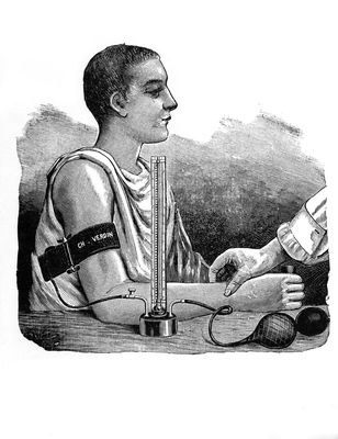 Credit: M0018871: Illustration of Riva-Rocci's spygmomanometer in use, 1908. Source: Wellcome Collection.
