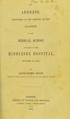 An address delivered at the opening of the classes of the Medical School attached to the Middlesex Hospital, October 1st, 1845 / by Alexander Shaw.