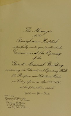 Credit: Addresses delivered at the opening of the Walter Garrett Memorial Building of the Pennsylvania Hospital, April 23, 1897. Source: Wellcome Collection.
