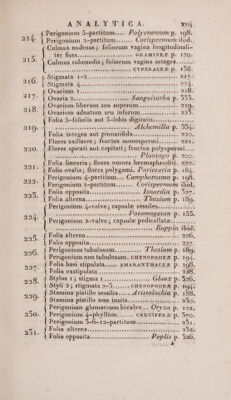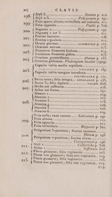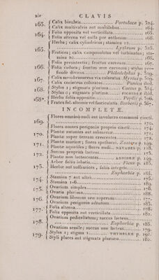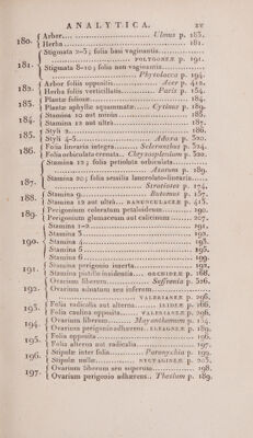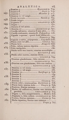 ![147. 140. 149. 150. i51. | 160. 162. ANALYTTIOC A. | xiij Stamina 4........-.-. cneseo Hypecoun p. 569. Stamina 6... 5e ge rh ves, Pberis p. 569i | Stamina 7... enhn . ZIEsculus p. 415. Stamina 10 vel magis....... eere iS RESI ad 140. Petala laciniata......... iassess Ztaseda;p. 504. i Paoli sui NM. . c Dri pedo 155, Stigmata 5..... iiy ds GERANIEJE p. 406. oce Ésisoirree AS NM I TE 159. Stamina 8 vel minüs...,.... sese. PPRIENS de. 19k. Stamina 10 ......... s. LEGUMINOSAE p. 940. Corolla calcarata; stamina 6 non ultrà...... 152. quum i ecalcarata; stamina 8. Poílygala p. 208. Capsula 1-sperma , penis haud deliscens...... (s CE HS TOM WT PRETI . Fumaria p. 569. Capsula 2-valvis, polysperma.. ... Cory dalis ibid; Flores rosei vel albi.................. Cercis p. 5541. d Flores lutei... TNT * dnagyris ibid. Foha, saltem j inis stipulata,.. Vasca «s. Mode d Folia exstipulata.;....... eese eeu TU p RR 156. Petala calici non inserta; stamina monadelpha.... ss] COH eR Im MIS CHART MALYACE/E p. 404. Petala calici inserta ; stamina libera................. E undeuso sepe doa Eds lia es ROSAGEJRE p. 329i Ovarium glandulosum ; folia carnosa.............. , Vissstuse visto) vedete diluit CRASSULACEJX p. 320. Ovarium non glandulosum ; folia non carnosa..... exse sodsubio ceocosavess RANUNCULAGEA D. 4154 pes 19 vel minis soodsad axe dei e 4. 198. Stamina 11 vel magis........... ses. iba ed. 165. | me Boniso eedri. ddiQt Secure p. 516, DEGUBAR O.cuor oisi eis IN SUM ra epos FM | . 159. DIADIIUA Di giccesax a Anh I qe Pe se ceto eT. 160. | DIDA Aus isse chiusi ethos biu sadpkito i. 102. Stamina 2...... DN M TT . Circeea p. ER M a rubri; semina pilosa. Koo oie p. 228. Flores lutei; semina nuda....... Onagra p. 526. Frutices ; fraolus GATIÓSIUS; 2 y» vo bici RON Ur Herbs vel suffrutices; fructus non carnosus bi- Lang 1; folia sempervirentia.... Hedera ibid. Stigmata 2; folia caduca. enossuLARLE p. 525. l'rutex ; fructus carnosus.......... Cornus p. 504. Herba MUN fructus non carnosus ............. VOIE vetare aeu viste het. Jrapa p. 527. E-Y](https://iiif.wellcomecollection.org/image/b33487273_0019.jp2/full/800%2C/0/default.jpg)