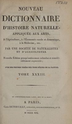 Nouveau dictionnaire d'histoire naturelle, appliquée aux arts, à l'agriculture, à l'économie rurale et domestique, à la médecine, etc / Par une société de naturalistes et d'agriculteurs.