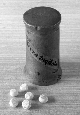 Credit: M0020091: Container for Terra Sigillata (medicinal clay), with some on display beside it, 17th century. Source: Wellcome Collection.