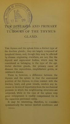 The diseases and primary tumours of the thymus gland / by H.D. Rolleston.