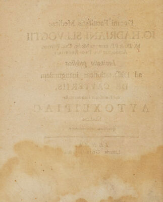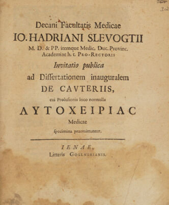 Credit: Invitatio publica ad dissertationem inauguralem de cauteriis, cui prolusionis loco nonnulla aytoxeipiac medicae specimina praemittuntur / [Johann Adrian Slevogt]. Source: Wellcome Collection.